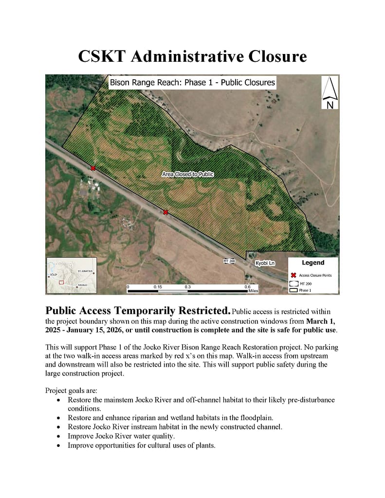 - Fall 2024 – Project was put out to bid in October, 2024. CSKT received 4 bids total, and selected Glacier Excavating Inc. based on the factors outlined in the RFP. See Documents and Links page for bid totals.